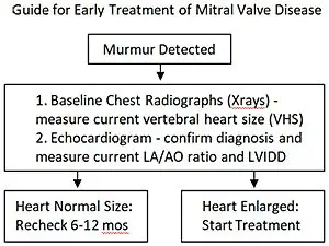 HEART MURMURSHeart murmurs are abnormal heart sounds caused by aberrant blood flow, for example by leaky heart valves allowing blood to flow backwards through the heart chambers or major vessels. Heart murmurs often create a “shhhussh” kind of sound which can be heard between the normal “LUB” and “DUB” heart sounds. A heart murmur indicates an abnormality of the heart, but does not definitively identify a specific heart disease. There are multiple heart diseases which can cause heart murmurs. Diagnosis of the heart disease causing a murmur requires an evaluation of the dog’s history, physical exam, and diagnostic tests like radiographs (Xrays) and echocardiography (ultrasound of the heart). |