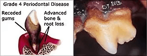 - Grade 4: The infection has receded the gums away from the tooth root and destroyed the bone around the tooth. There is significant pain in the tooth and surrounding area. An odor is noticeable. The condition is usually irreversible for the tooth, which must be extracted in order to alleviate pain and eliminate the infection in the gums and surrounding bone.