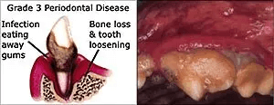- Grade 3: The infection has eaten away at the gums (receded gums) and is destroying the bone around the tooth. The gums are tender and may bleed when touched. There is pain in the tooth and surrounding area. An odor is noticeable. The condition may be irreversible, but if the tooth is still solid, the infection can be controlled with regularly scheduled sub-gingival dental cleanings and a rigorous home care schedule.